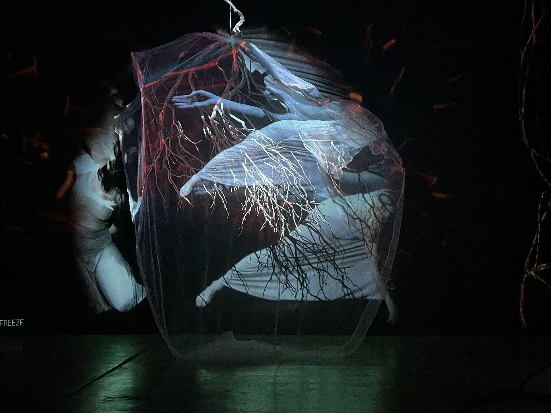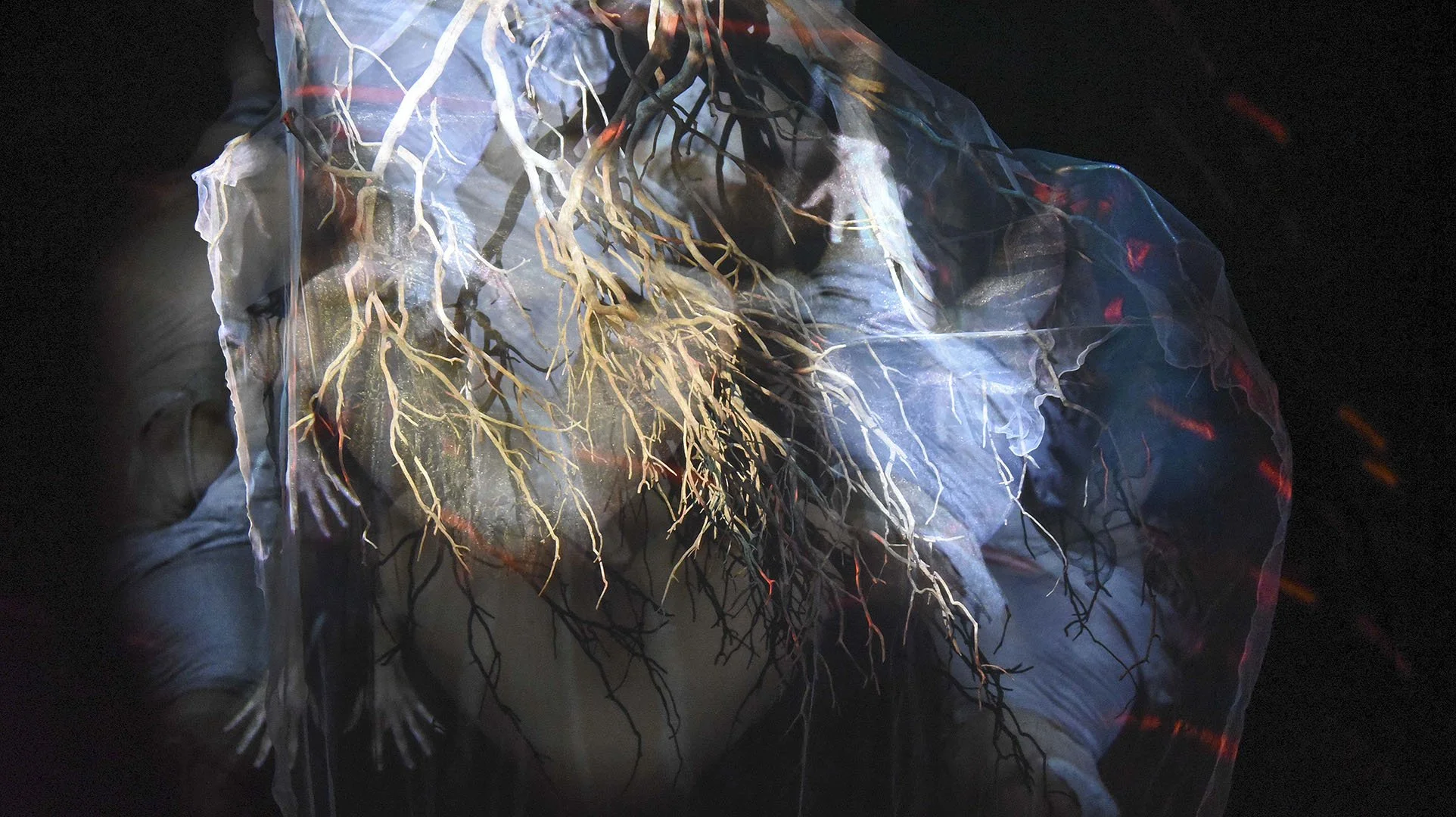 Media/Details: Media: Tree branches, transparent projection scrim, ivy vines, projection mapping, creative coding, immersive sound installation, live performance, 35’ x 24’ x 22’H